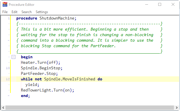 In this procedure, the part feeder comes to a complete stop before the procedure checks if the spindle has finished moving: