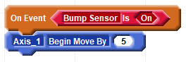 This block list initiates motion when the Bump Sensor first turns on and moves the motor a distance of 5 past the location where the last Bump Sensor transition on occurred: