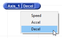 The Decel block returns the current deceleration setting for the axis or axis group. The units are User Units per second squared.