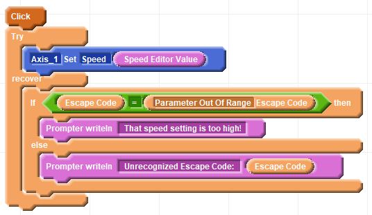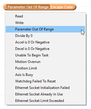 The Escape Code Constants block is used for identifying an Escape Code in the "Recover" block list of a Try Recover block. Rather than referring to escape code numbers the Escape Code Constants provide meaningful names that help explain the nature of the error.