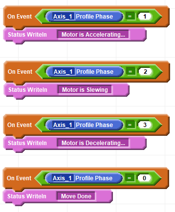 Profile Phase indicates if the trapezoidal motion profile is in the Accel phase (value 1), the Slew phase (value 2) the Decel phase (value 3), or no longer moving (value 0).