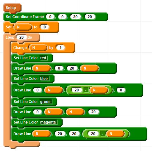 It is more efficient to do all of the lines for any one color in a single loop and move on to the next color with a separate loop but this form is more compact.