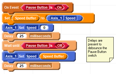 This block list accomplishes motion pause and resume behavior by recording the current speed setting, setting the speed to zero to continue the move at zero speed, and then restores the speed to resume: