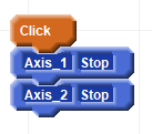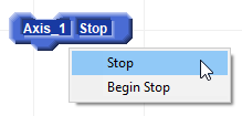 The Stop block directs the axis or group to slow down at the specified decel rate and stop motion. This can be used to stop a continuous Jog or to stop a move early. A coordinated