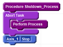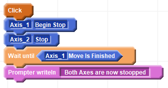This block list stops a number of motors in sequence. The first will start decelerating, come to a complete stop, and then the second axis will start to decelerate. This will create a staggered stop effect: