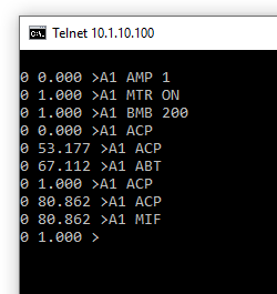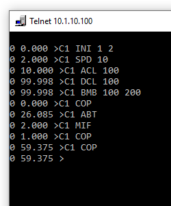 This command sequence relates to axis 1. The current is set to 1 amp, the motor is turned on, a relative move is started to a destination of 200.