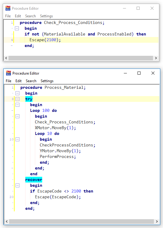 Although often used within loops the Exit block should not be confused with the C language "Break" command. Exit does not just exit the loop, it exits the entire procedure and is more like the C language "return".